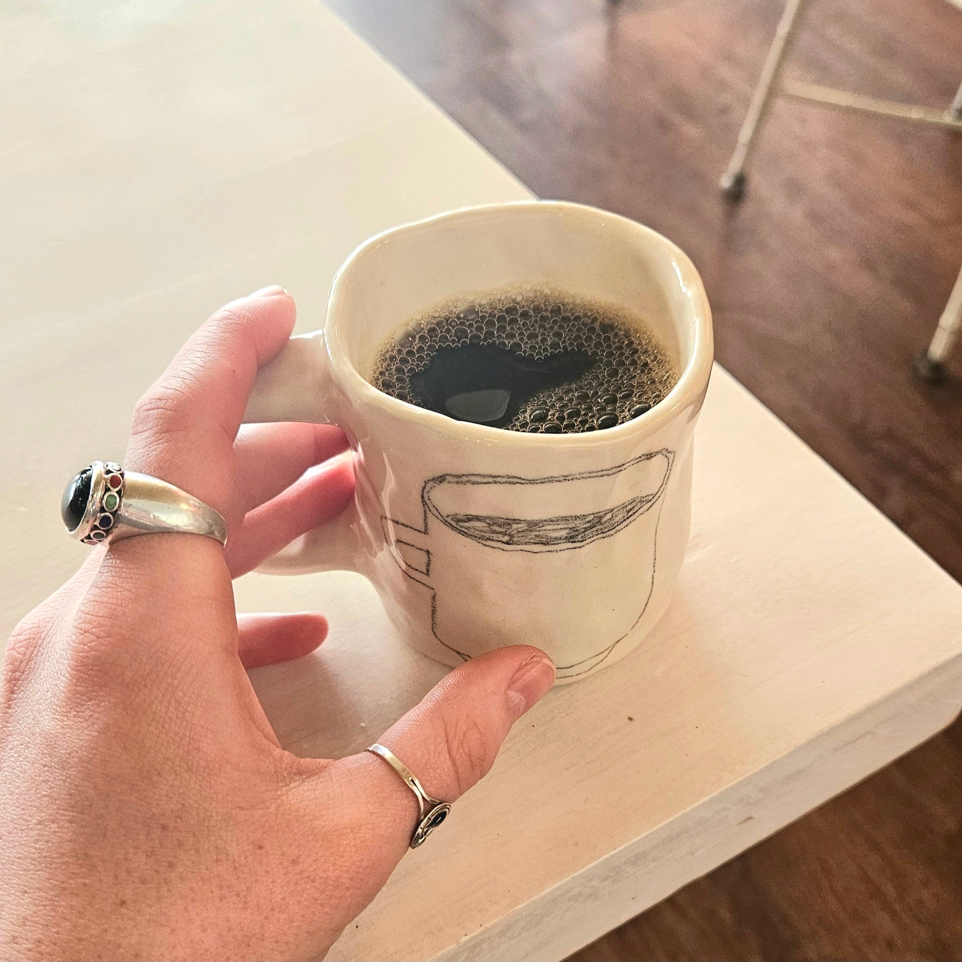 This listing is for Pre-Orders. Once you place your order you can expect your mug to be ready for pick up/delivery in two weeks. This is a hand-built item with a hand drawn image on it, so please keep in mind shape and scale will vary mug to mug. Holds 10-12ish ounces :)